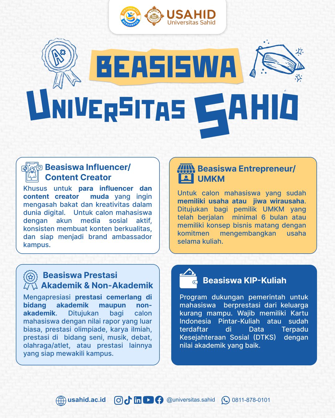 USAHID menyediakan empat kategori beasiswa yang dirancang untuk mengakomodasi berbagai latar belakang dan keunggulan calon mahasiswa: