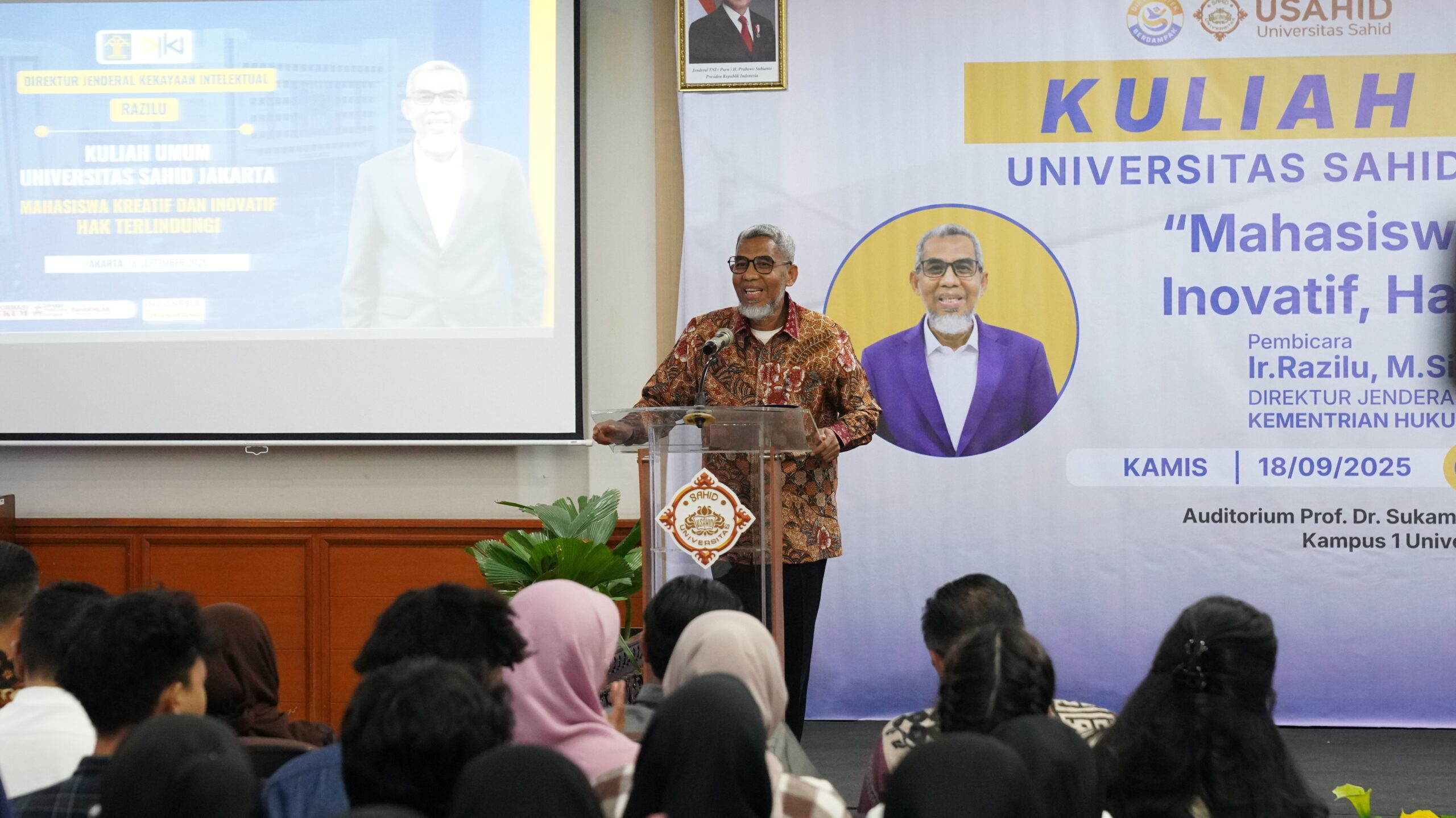Jakarta, 18 September 2025 – Universitas Sahid (USAHID) Jakarta mencatatkan prestasi membanggakan dalam penyelenggaraan Kuliah Umum bagi mahasiswa baru Tahun Akademik 2025/2026. Acara yang diselenggarakan di Aula Prof. Dr. Sukamdani Sahid Gitosardjono, Kampus 1 USAHID ini berhasil meraih apresiasi khusus dari Direktorat Jenderal Kekayaan Intelektual (DJKI) Kementerian Hukum dan HAM RI.