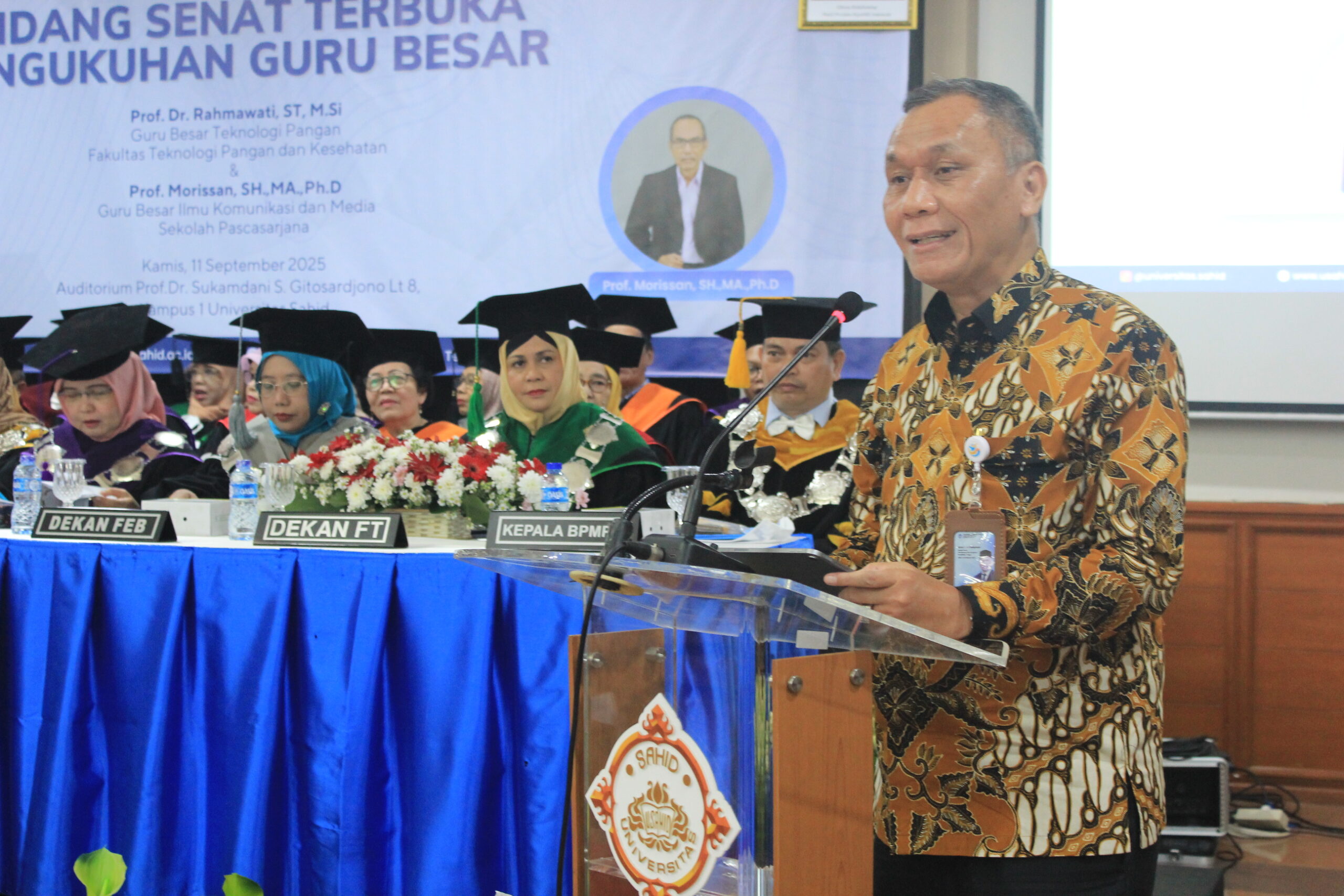 Jakarta, 11 September 2025 – Universitas Sahid (USAHID) mengukuhkan dua Guru Besar baru dalam Sidang Senat Terbuka yang berlangsung di Auditorium Prof. Dr. Sukamdani Sahid Gitosardjono, Kampus 1 USAHID pada Kamis, 11 September 2025. Kedua Guru Besar yang dikukuhkan adalah Prof. Dr. Rahmawati, ST, M.Si sebagai Guru Besar Teknologi Pangan Fakultas Teknologi Pangan dan Kesehatan USAHID, dan Prof. Morissan, SH, MA, Ph.D sebagai Guru Besar Ilmu Komunikasi dan Media Sekolah Pascasarjana USAHID.